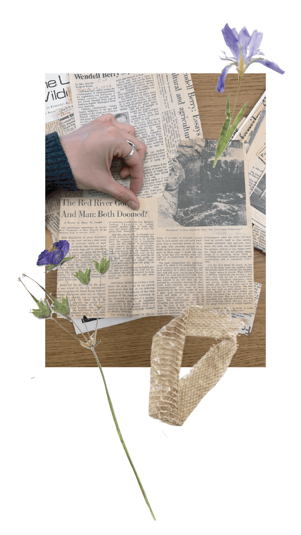 *One line taken from an old newspaper article: “lichened, castle-like crags?” This was written by Harry M. Caudill about Wendell Berry and Red River Gorge. I felt that my own description of a place dear to me was missing a couple words, and was glad to find Caudill’s to add to it. Photo of newspaper article to the side.